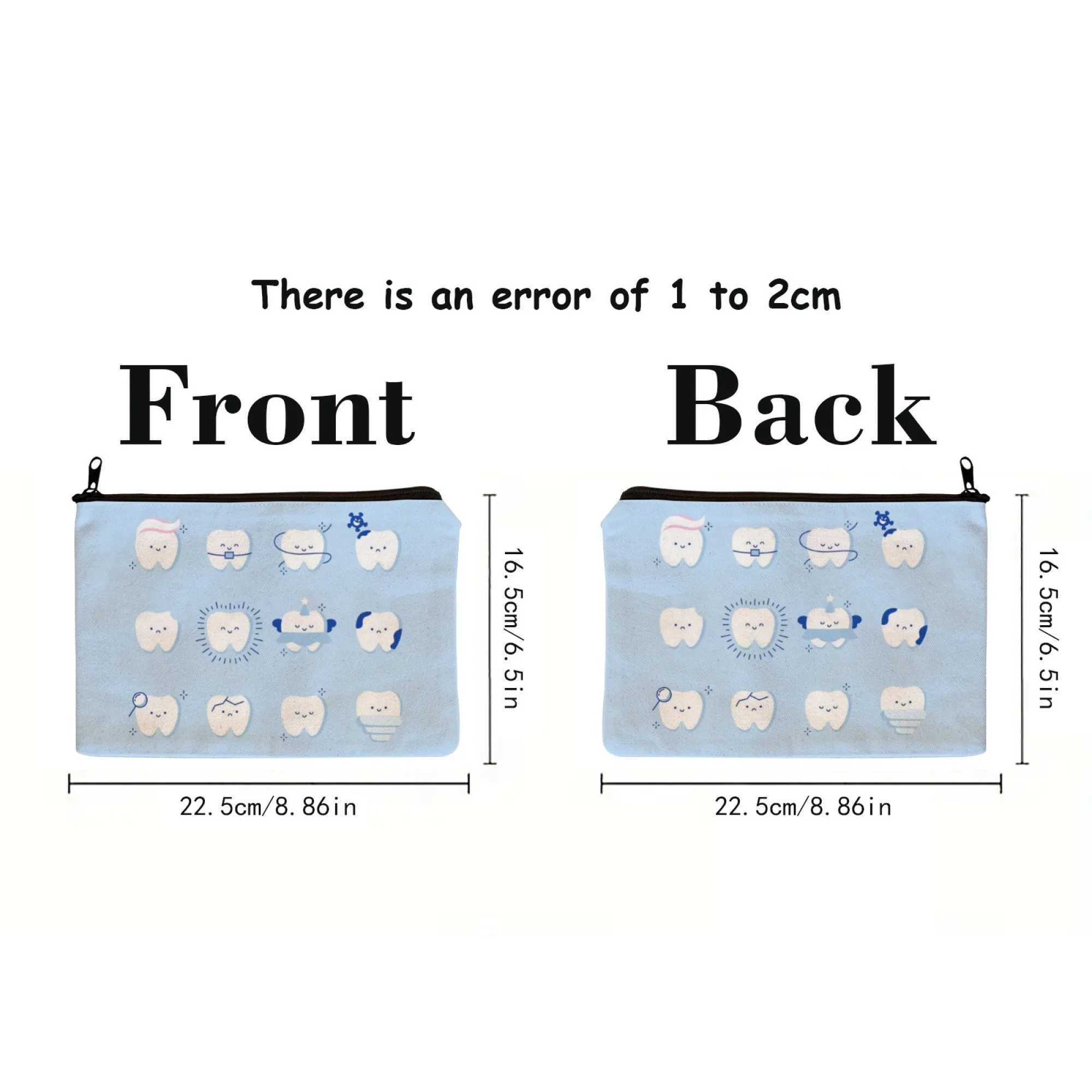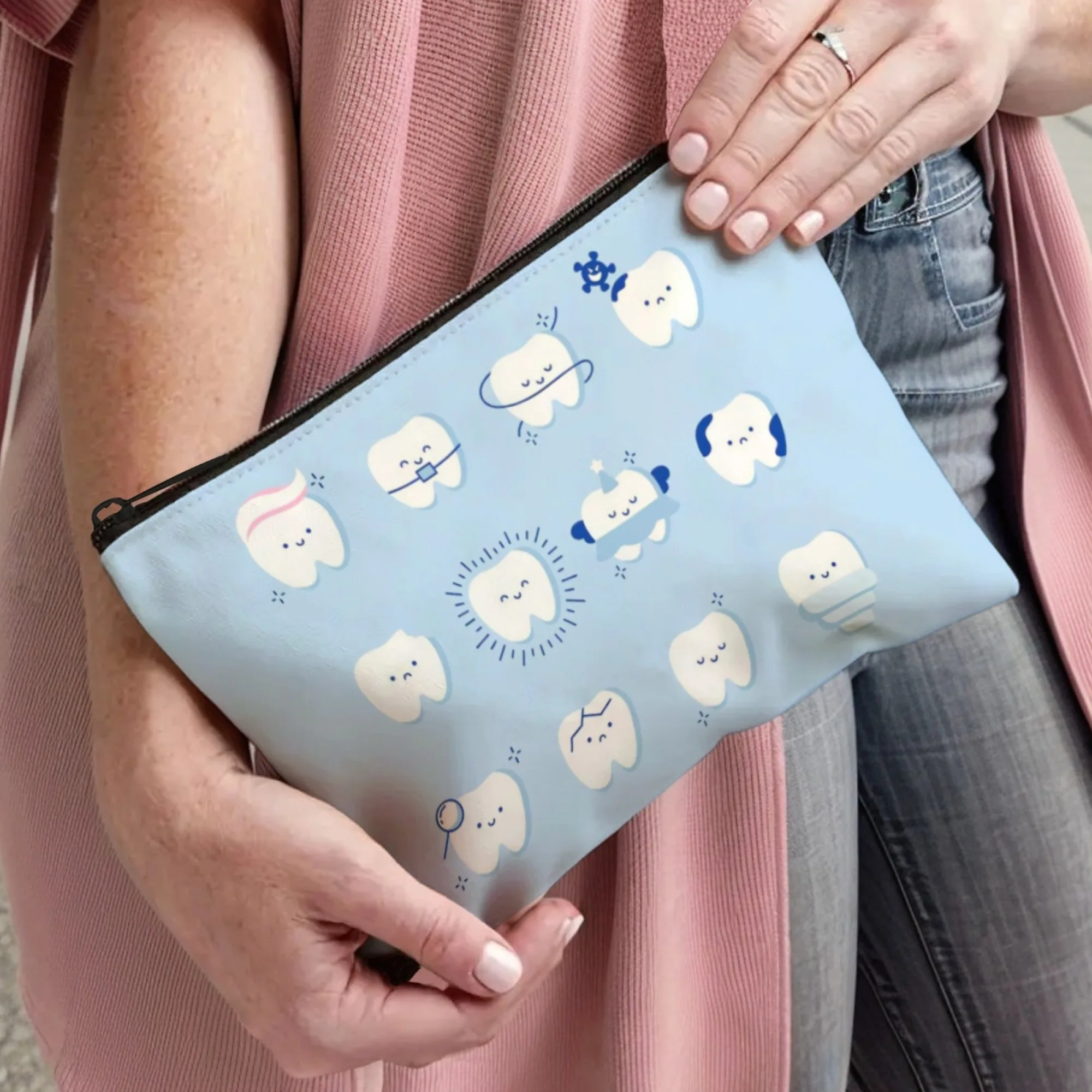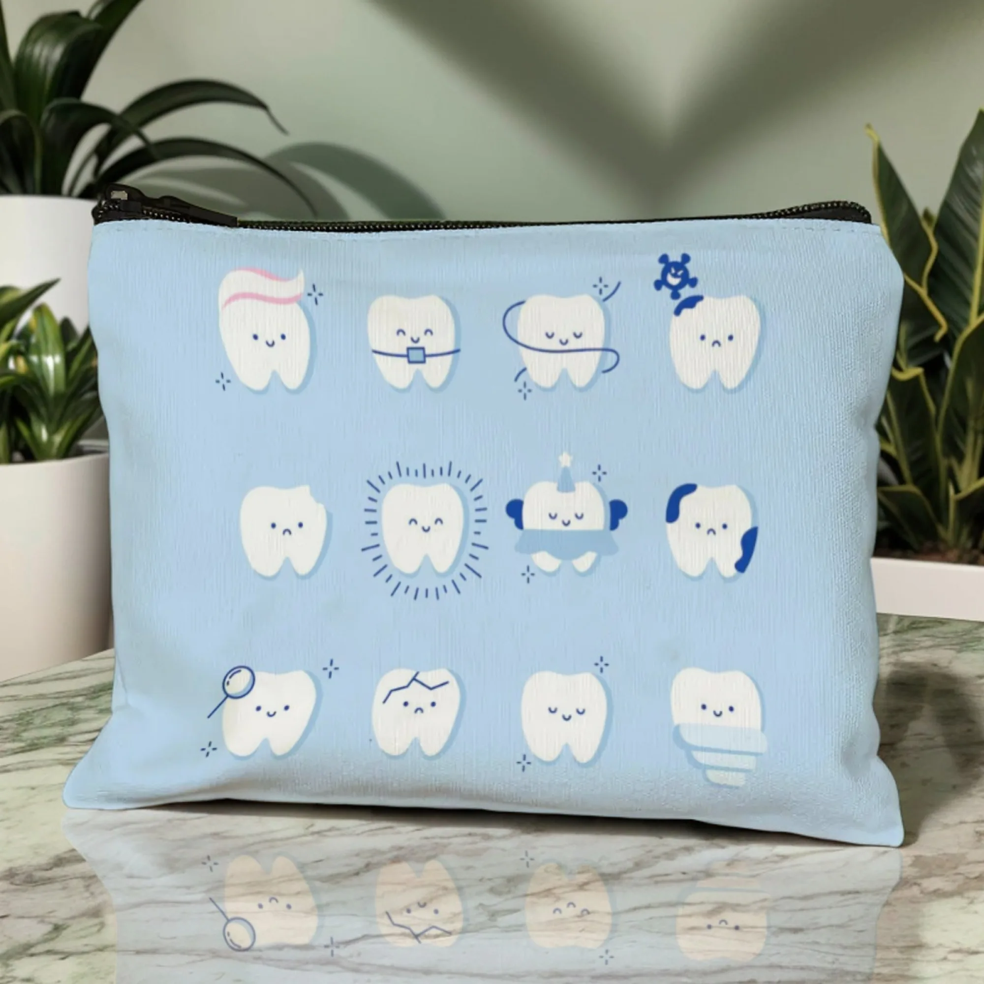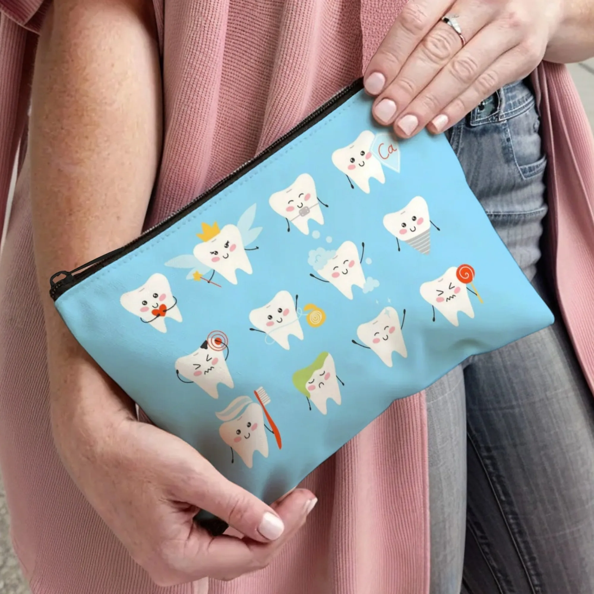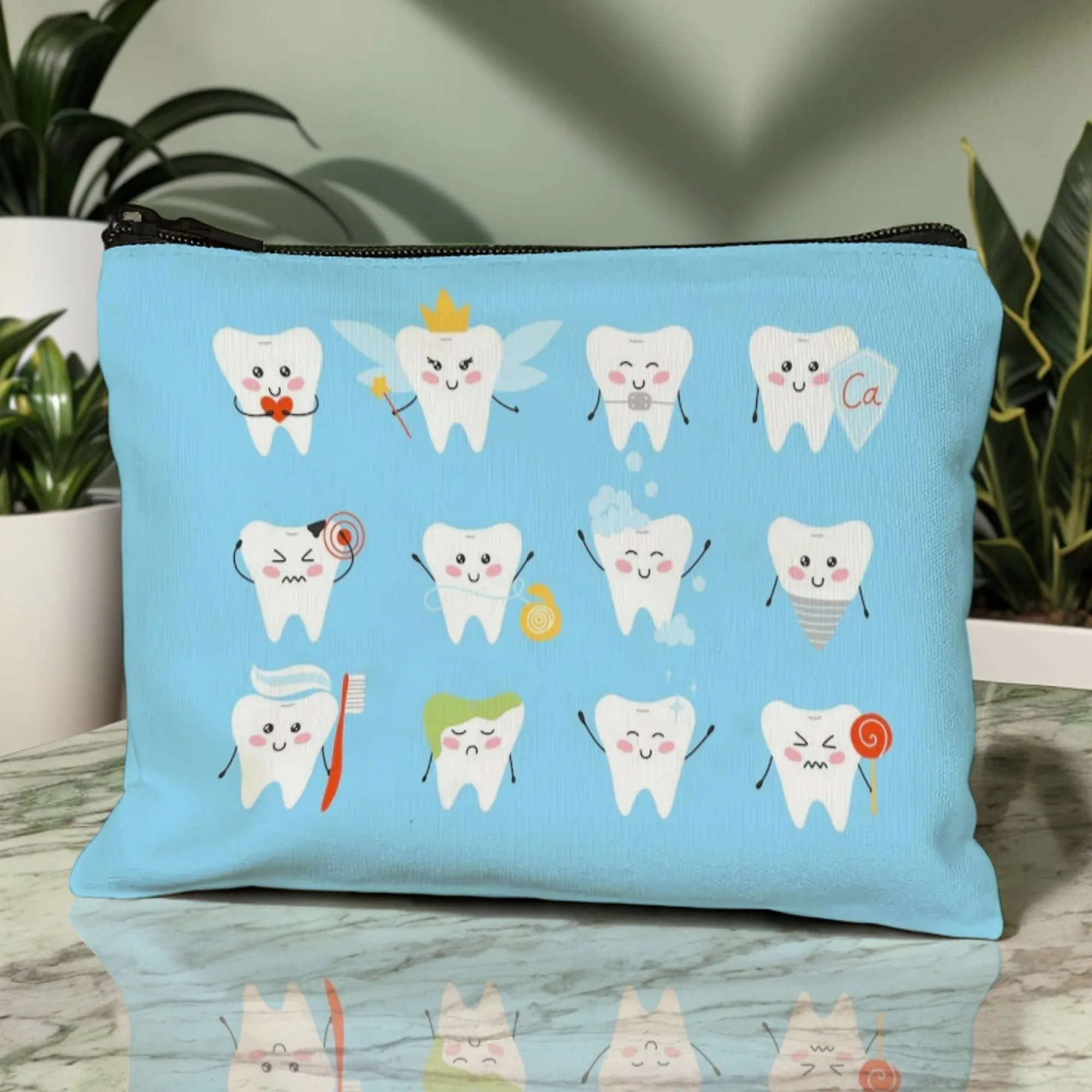 Sparkling Tooth Tale Cosmetic Pouch Dental-Themed Cartoon Teeth with Glitter & Fairy Wings Zippered Makeup Bag for Daily Use
